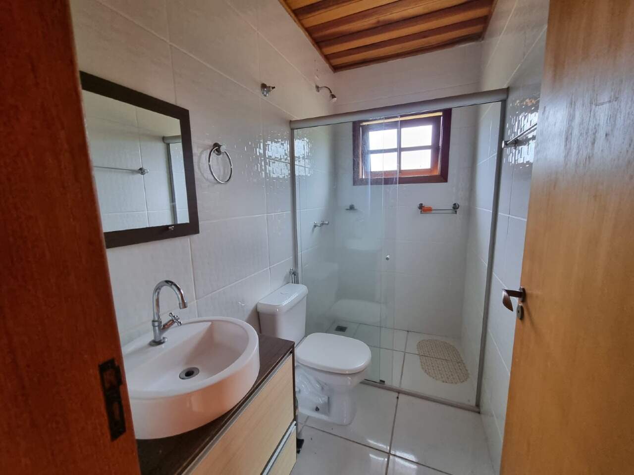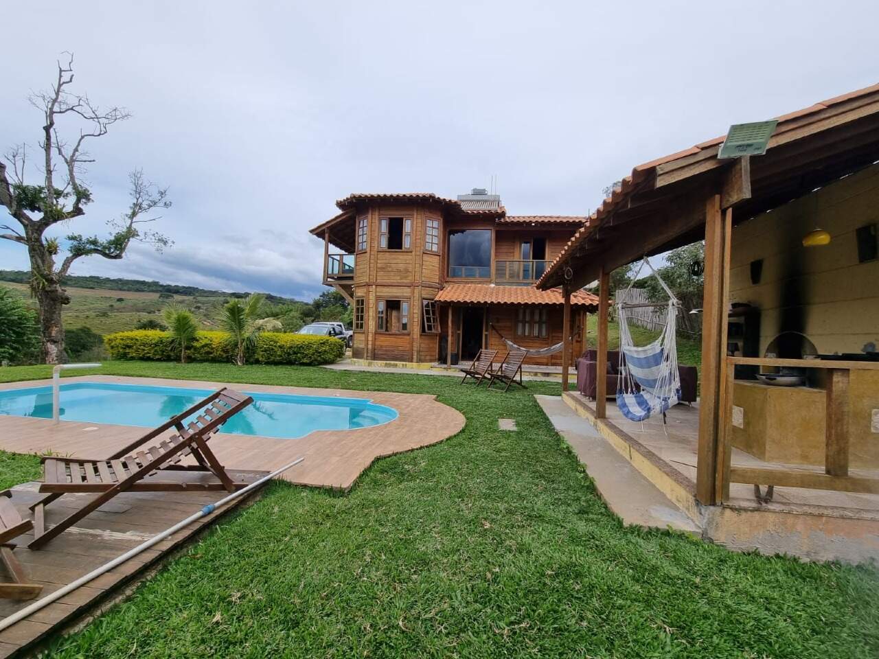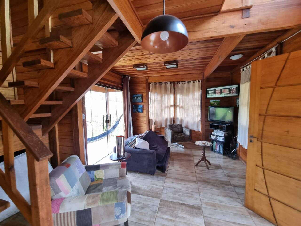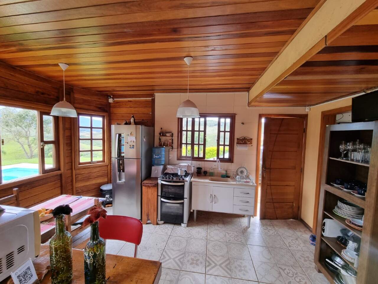 1 suíte com varanda, 1 quarto com varanda, 1 banheiro social, sala com varanda, cozinha com lavabo e dispensa, área gourmet com fogão a lenha e forno iglu, ainda uma linda piscina, pomar, jardim muito bem cuidado e estacionamento amplo.