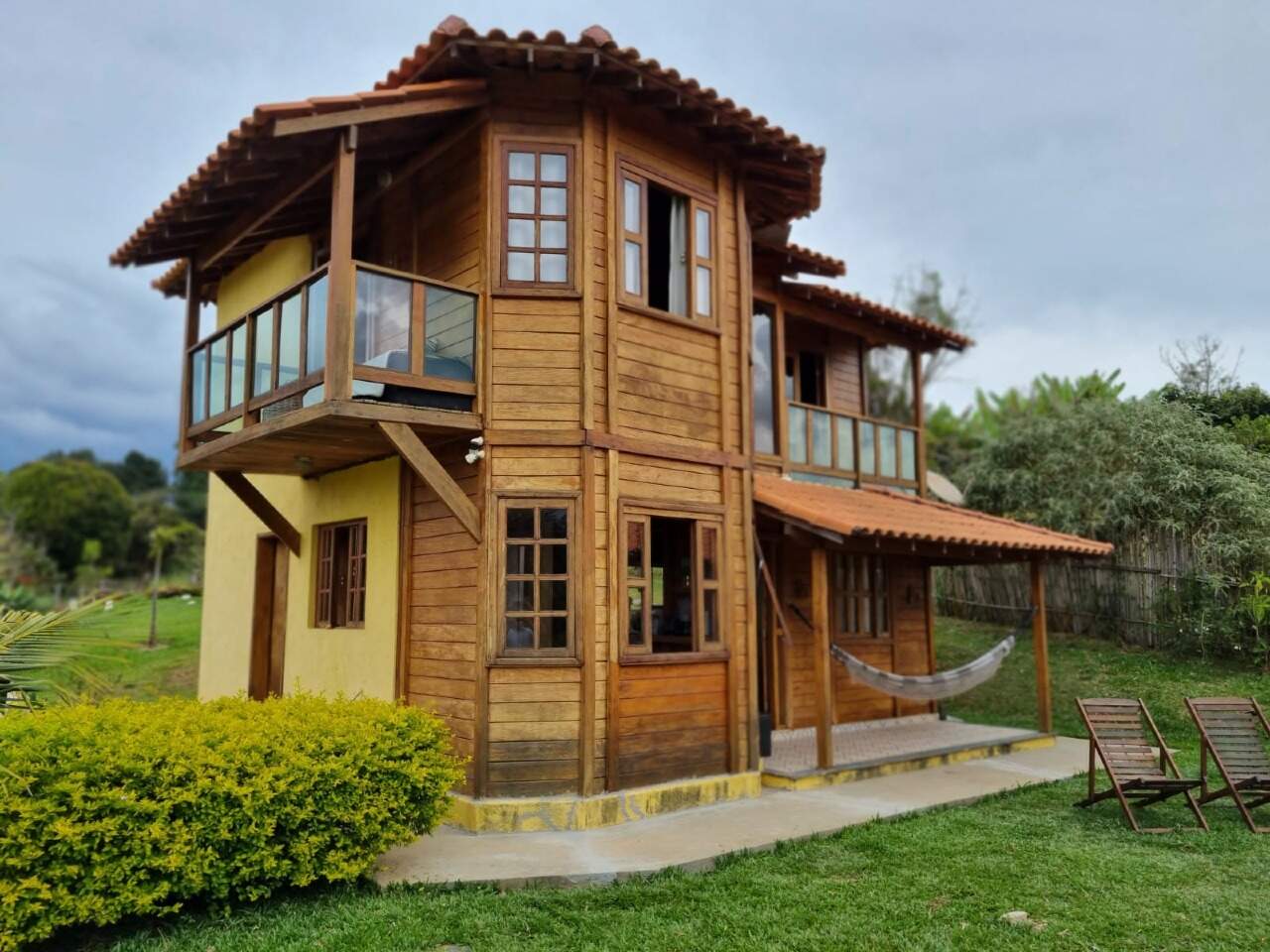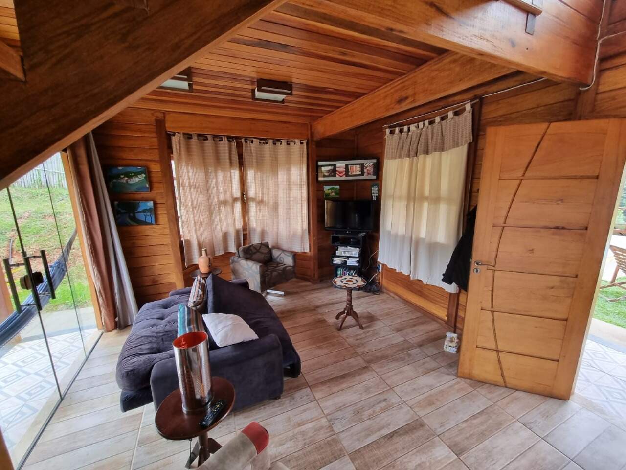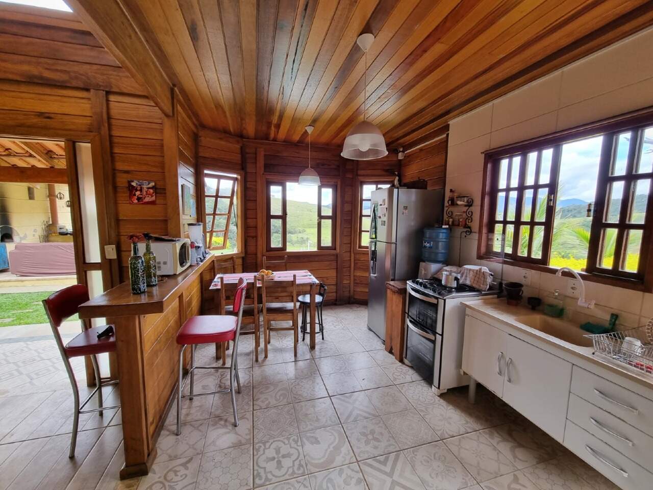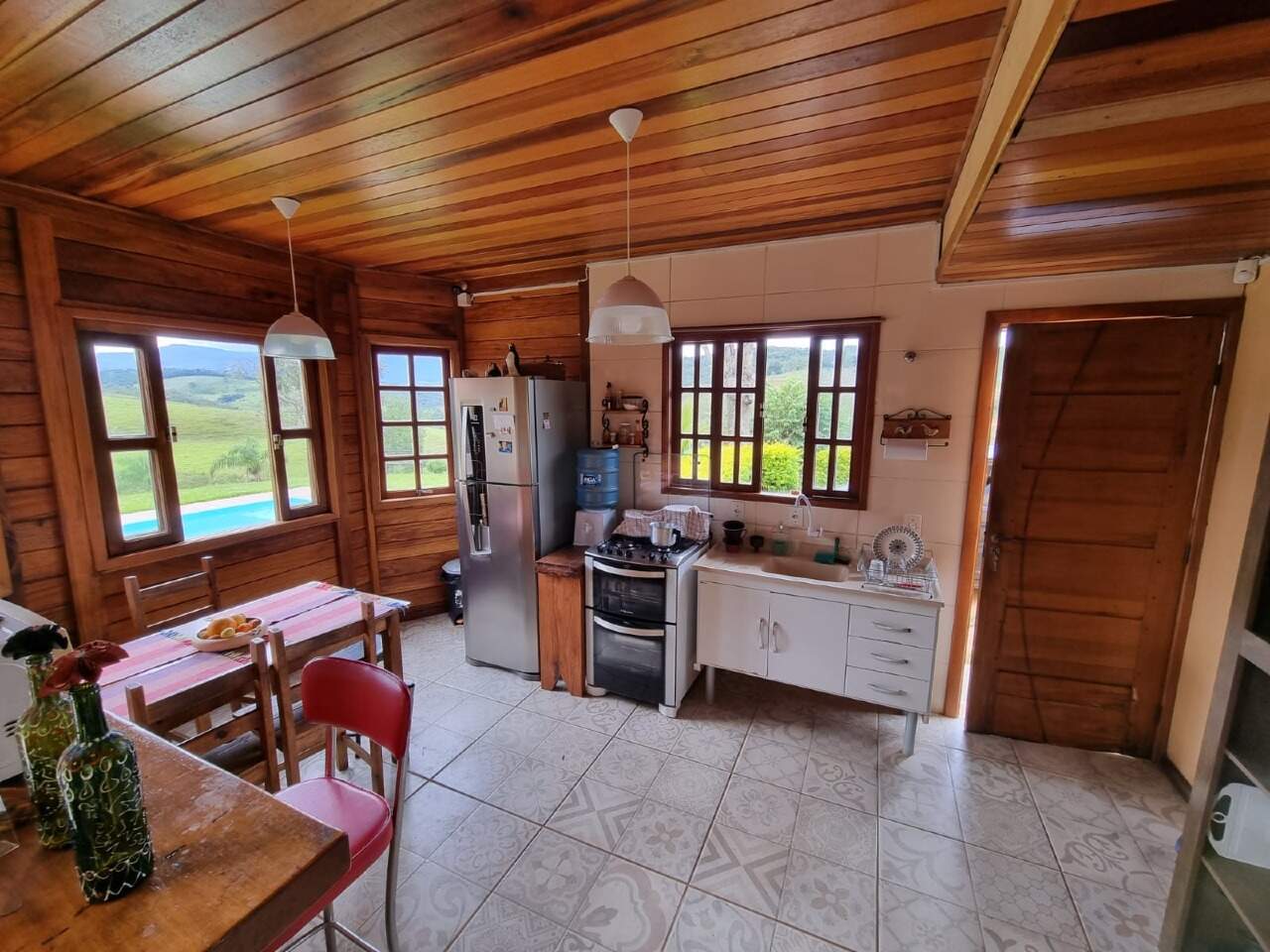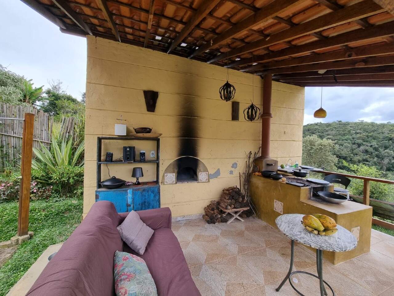 1 suíte com varanda, 1 quarto com varanda, 1 banheiro social, sala com varanda, cozinha com lavabo e dispensa, área gourmet com fogão a lenha e forno iglu, ainda uma linda piscina, pomar, jardim muito bem cuidado e estacionamento amplo.